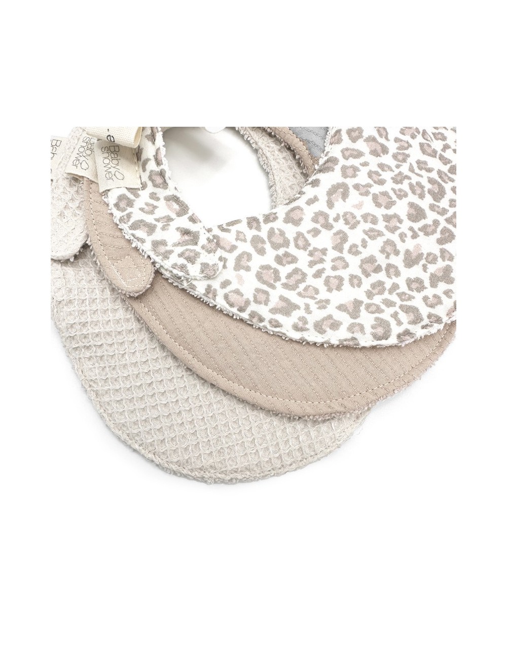 Bavoir pendant les premiers mois et jusqu’à un an. Devant en tissu de coton imprimé. Revers avec une serviette blanche haute densité.