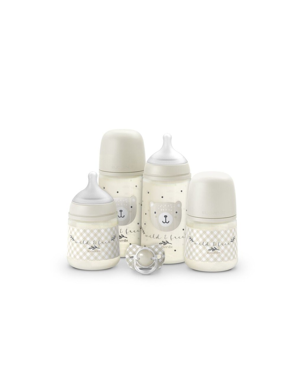 Le set nouveau-né de la collection Wild&Free réunit l’indispensable pour bien démarrer : une sucette SX Pro™ 0-6m et 4 biberons en silicone souple (2x150ml avec tétine débit lent + 2x270ml avec tétine débit moyen). Un kit complet, évolutif et idéal comme cadeau de naissance. Dès la naissance (+0m).