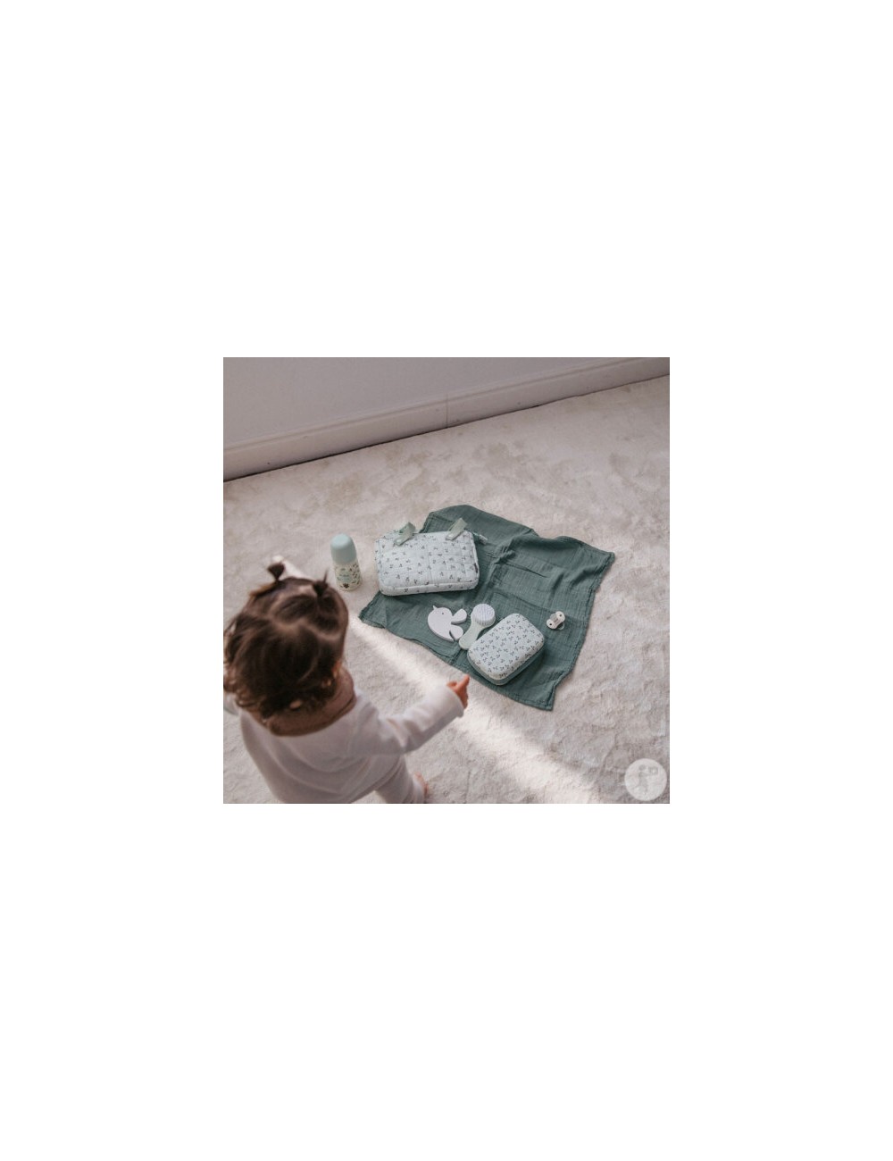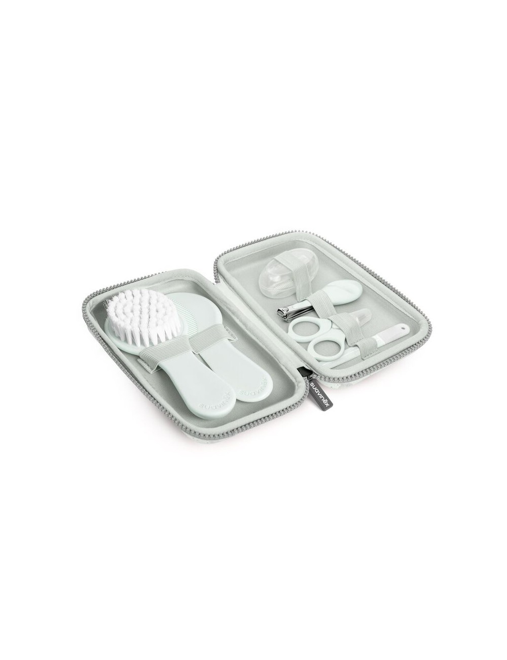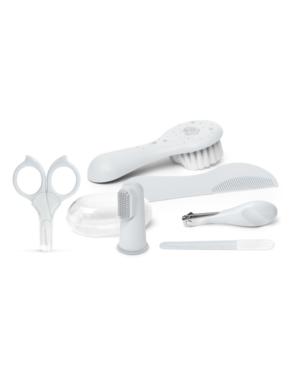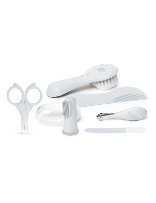 Neuf accessoires indispensables pour la toilette et les soins de bébé : thermomètre de bain, thermomètre digital, ciseaux, coupe-ongles, brosse à cheveux, anneau de dentition, masseur de gencives, mouche bébé manuel, lime à ongles