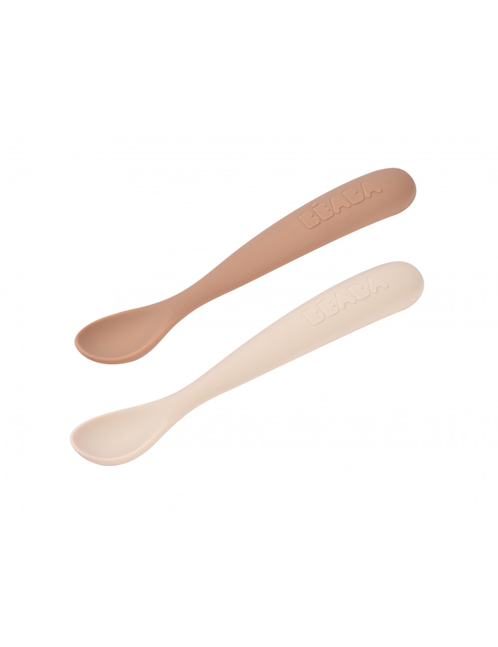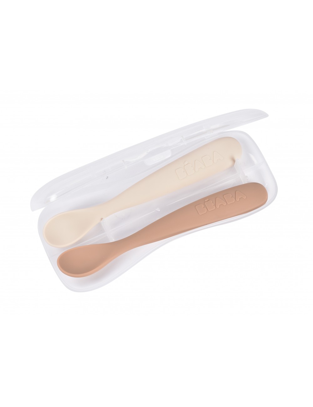 Lot 2 Cuillères 1er âge silicone + boite de transport beige béaba.