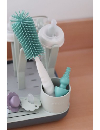 Le goupillon est équipé d'un mini embout intégré, souple et texturé, idéal pour nettoyer les tétines et les petits accessoires. Pratique, il est doté d'un manche large pour une bonne préhension et d'un anneau d'accroche qui permet de le suspendre facilement pour un séchage optimal.