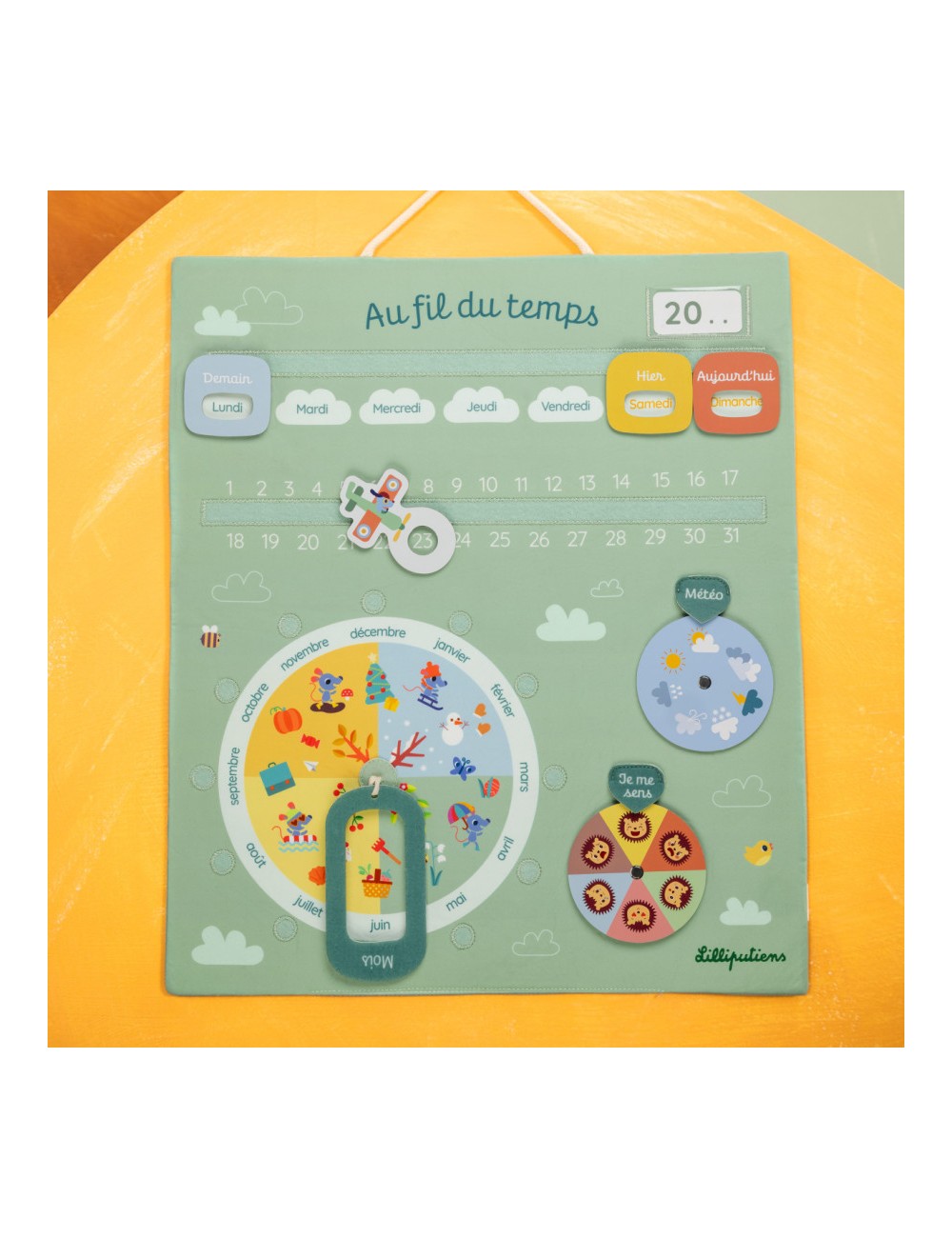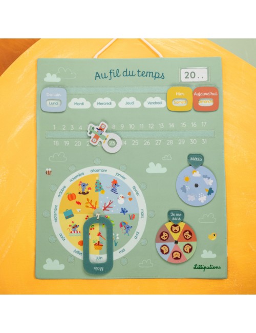 Calendrier enfant en tissu "Au fil du temps"Le premier calendrier des enfants ! Chaque jour est l'occasion d'apprendre à se repérer dans le temps avec notre calendrier en tissu, pour les petits à partir de 3 ans. C'est le support idéal pour les aider à mieux comprendre la notion de temps qui passe et à identifier leurs émotions. Grâce à ses mollettes à tourner et ses éléments avec scratch, l'agenda permet d'indiquer : la date du jour ainsi que les notions d’hier et de demain, le mois et la saison à laquelle il correspond, l’année en cours, la météo et son humeur pour la journée.