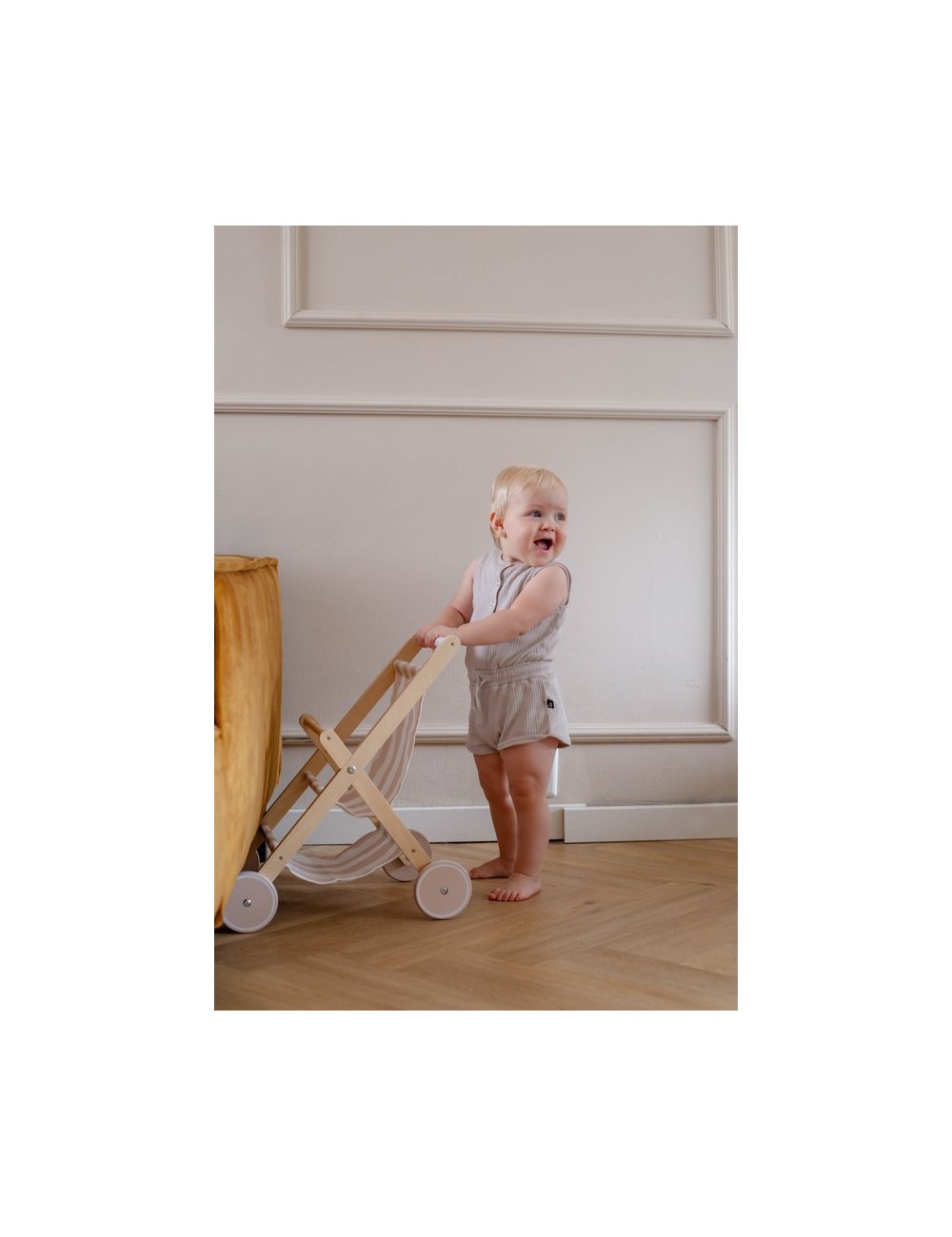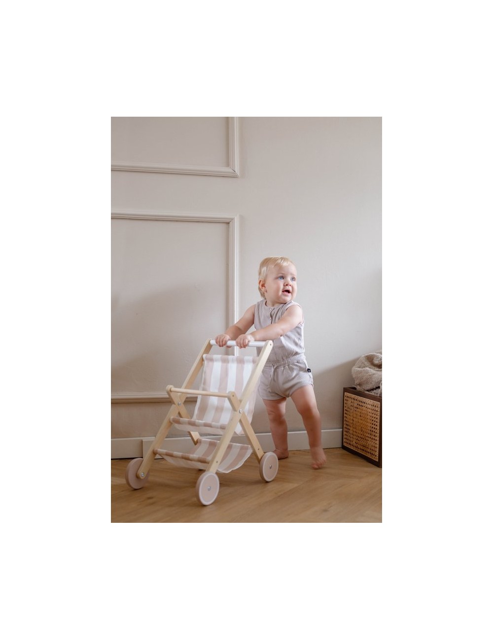 Le cadre et les roues sont en bois robuste et le siège est en tissu avec un joli imprimé. Cela le rend également joli dans la pièce ! Grâce au panier en bas, votre tout-petit peut également emporter avec lui des speelgoed supplémentaires pendant la promenade. Tout le monde se joindra à nous pour cette sortie amusante !