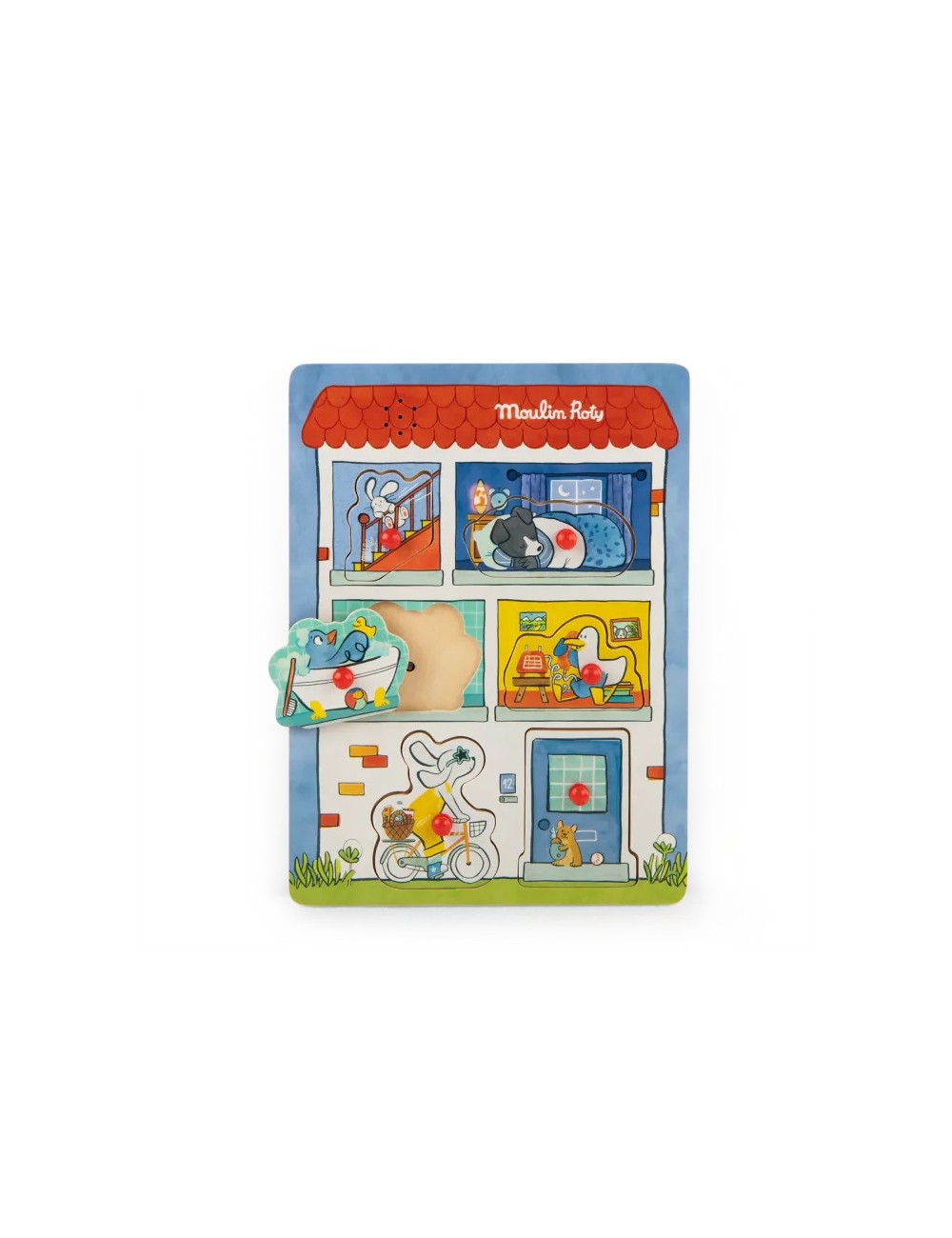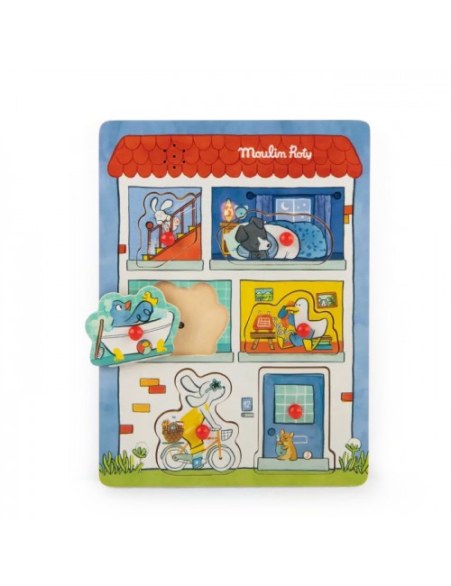 Puzzle sonore pour s'éveiller à la musique de manière ludique. Replace les 6 pièces en bois qui composent la maison de Puce & Pilou en y découvrant les sons du quotidien : sonnette, téléphone... Permet aussi d'appréhender les formes et les couleurs.