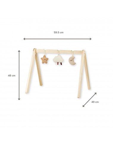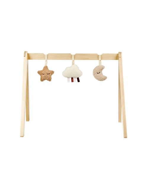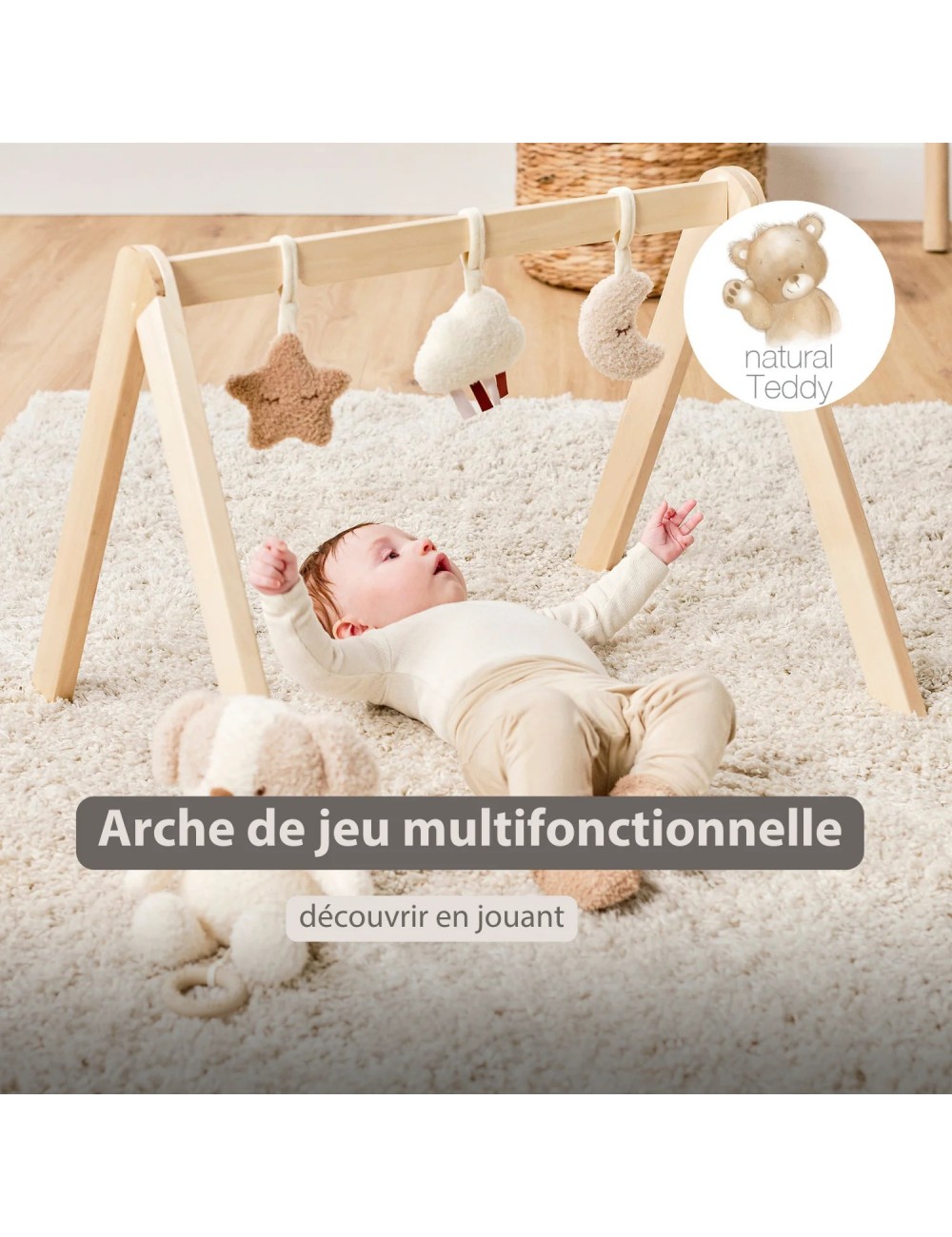 Avec cet arche de jeu en bois avec jouets en teddy, vous créez un espace de jeu où votre bébé peut s’amuser pendant des heures. L’arche en bois solide sert de base, tandis que trois suspensions douces et câlines invitent votre bébé à saisir, toucher et écouter. Les différentes activités comme hochet, sifflet et papier bruissant stimulent motricité et sens de manière ludique. Une combinaison idéale de matériaux naturels et de design mignon, parfaite à la maison ou en déplacement.