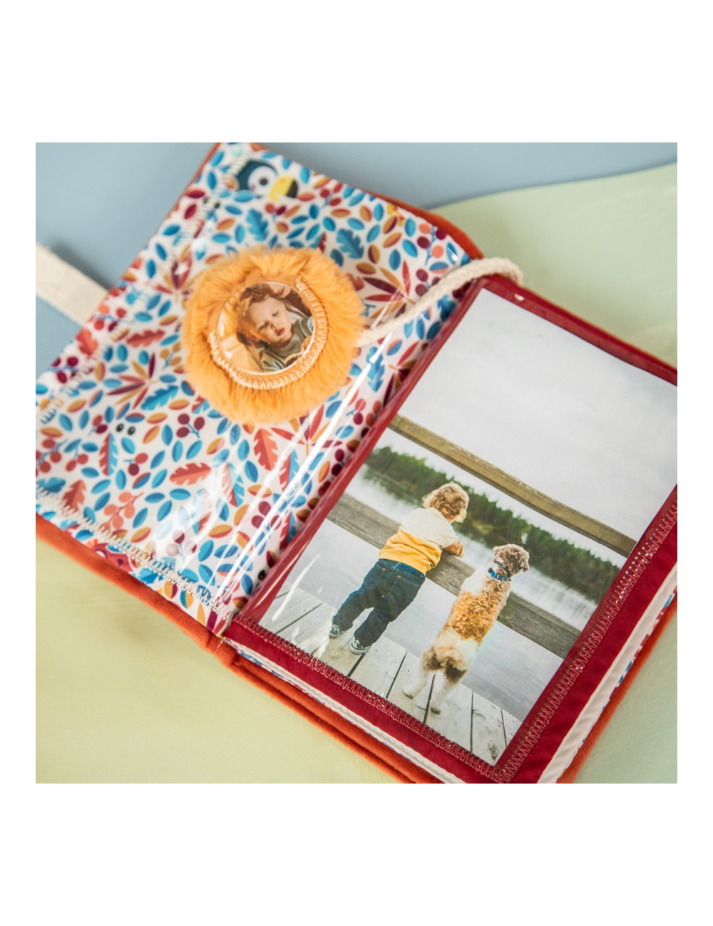 Son premier album photo, pour ses premiers clichés ! Cet album photo en tissu tout doux permet à votre enfant de garder les photos de ses proches toujours près de lui. Il a été pensé pour une manipulation dès l'âge de 9 mois. L'album photo Jack le lion dispose de 10 pochettes pour glisser vos plus beaux souvenirs, bien protégés. Chaque page à l'intérieur de l'album est décorée de jolies illustrations, inspirées de l'univers de notre lion musicien et de ses copains. Une fois vos photos ajoutées, elles seront bien mises en valeur par les différents motifs et coloris des décors. Le plus de cet album photo pour bébé ? Son marque-page spécial décoré d’un perroquet : au dos de celui-ci, glissez la photo de votre enfant pour personnaliser son album. Sa forme ronde est idéale à manipuler par les petits, qui pourront le câliner ou l’utiliser pour marquer les pages comme les grands. Dans son format portrait vertical, l'album photo Lilliputiens peut être emporté partout pour feuilleter ses plus beaux clichés avec joie
