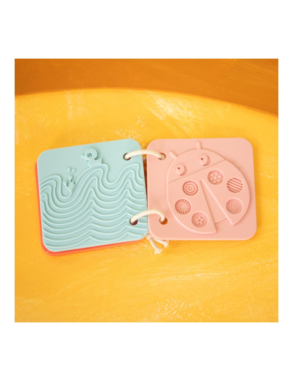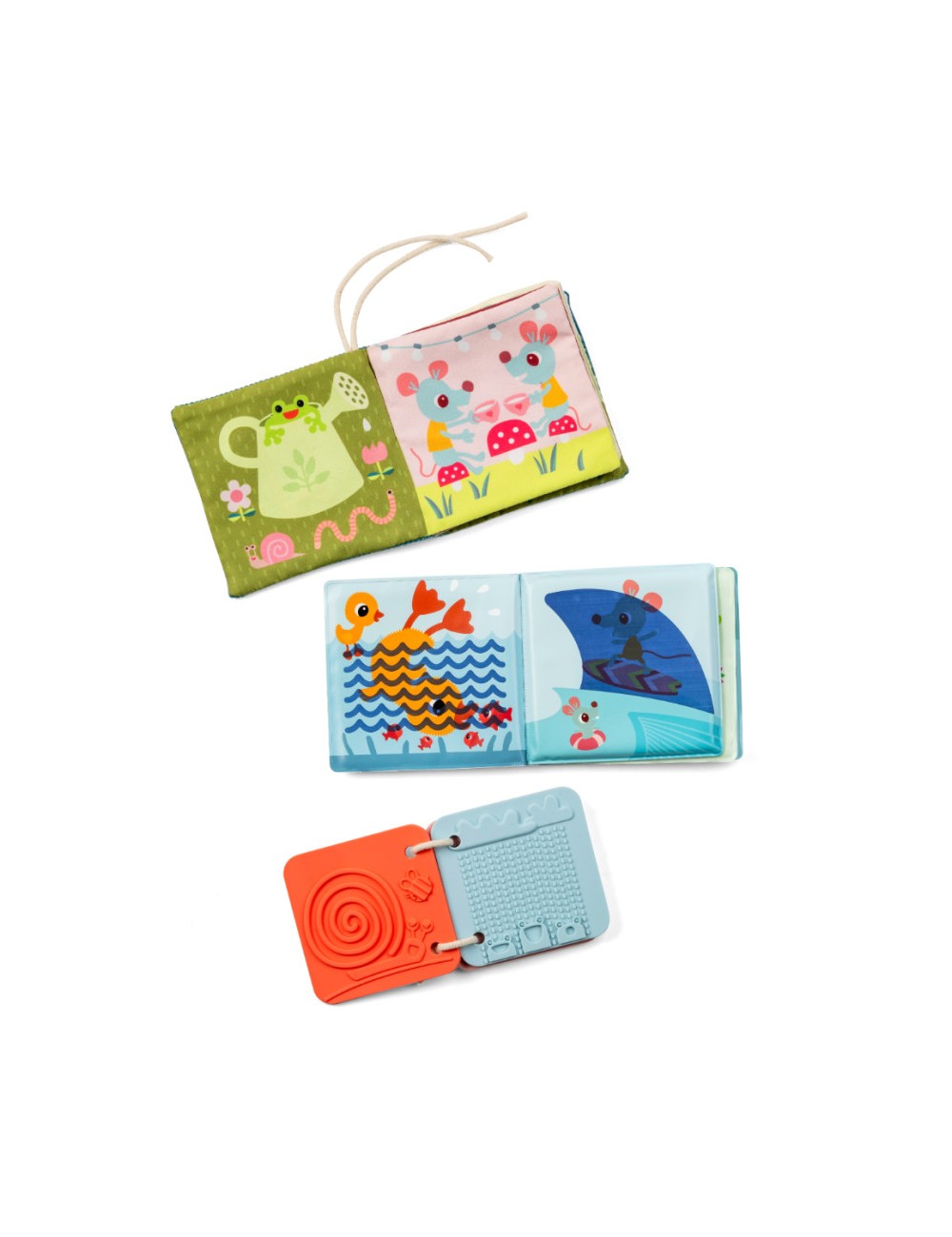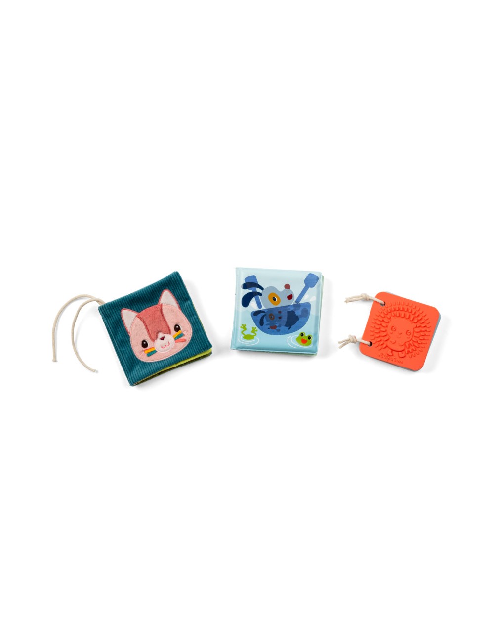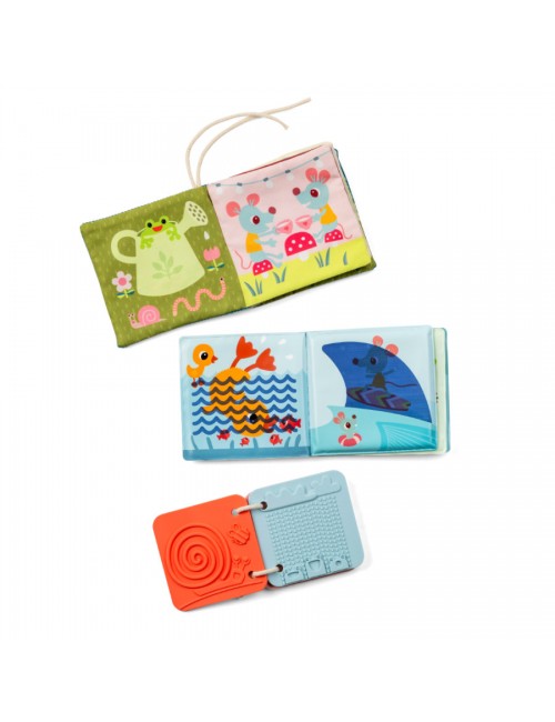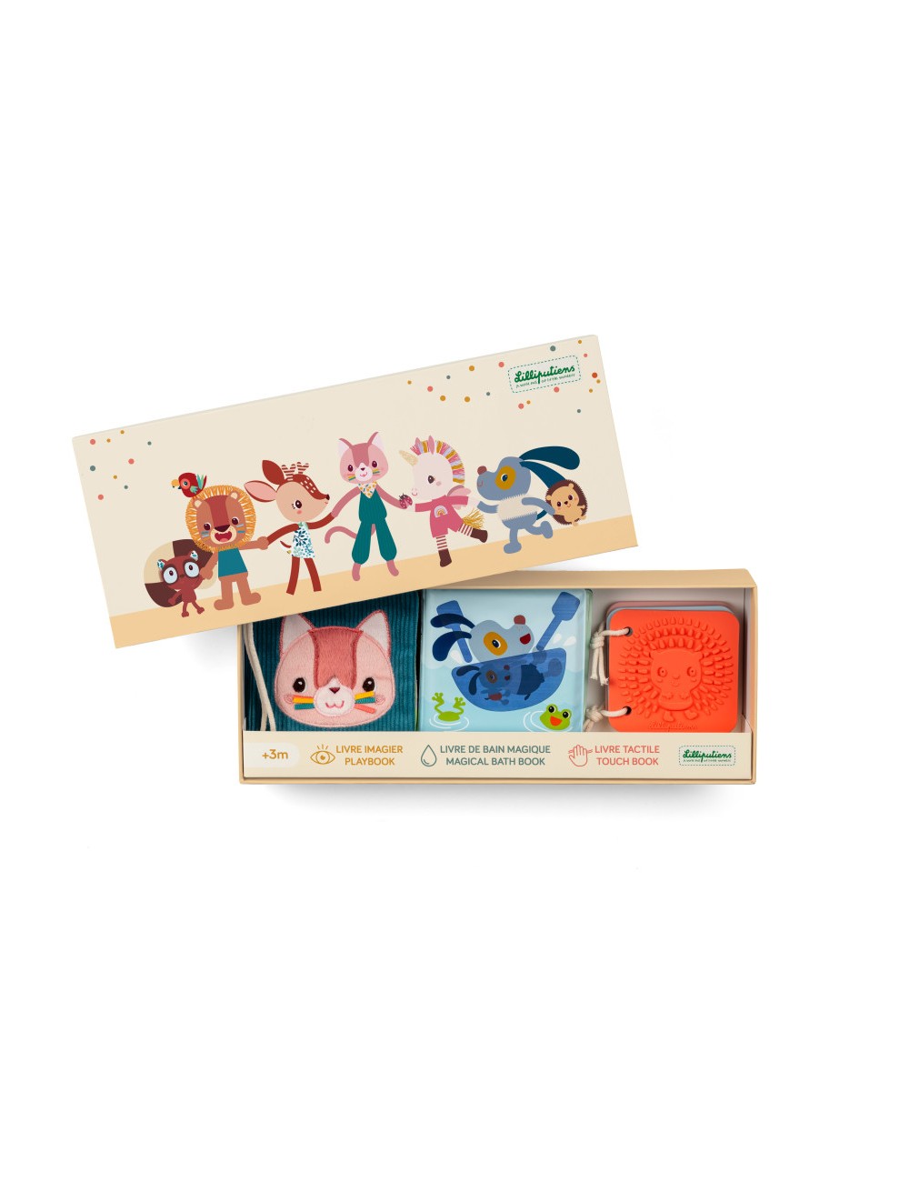 Offrez ces premiers livres sensoriels à bébé ! Ce set de 3 livres d’éveil en différentes matières convient dès la naissance : un cadeau idéal, qui saura éveiller les sens et titiller la curiosité des petits. Présentés dans leur joli coffret illustré, ces jouets d’éveil sensoriel proposent 3 histoires sur le thème du jardin. Pour cela, retrouvez : un livre en tissu avec de nombreuses textures et illustrations à découvrir, un imagier en silicone à parcourir du bout des doigts, et un livre de bain magique dans lequel les illustrations apparaissent au contact de l’eau. Ce trio stimulant et coloré se pare d’illustrations originales, mettant en scène Jeanne le chat, Jules le chien, et bien d’autres nouveaux amis ! Ce sont les premiers compagnons de bébé, pour des premières histoires à partager ensemble ! Avec ces livres d’éveil, il apprend à être curieux et s’éveille au monde à son rythme. A l’heure du bain, comme au moment de se coucher, ou encore pendant ses temps d’éveil. Leur forme et leur taille ont été pensé