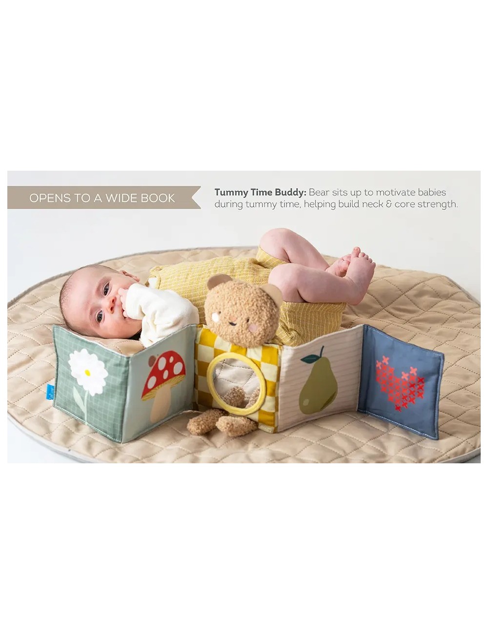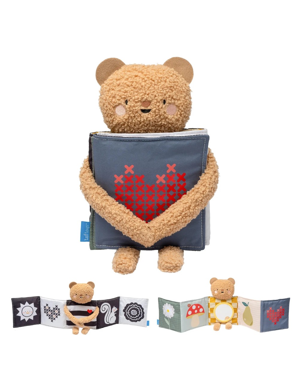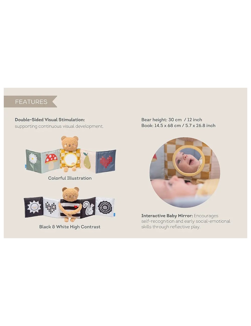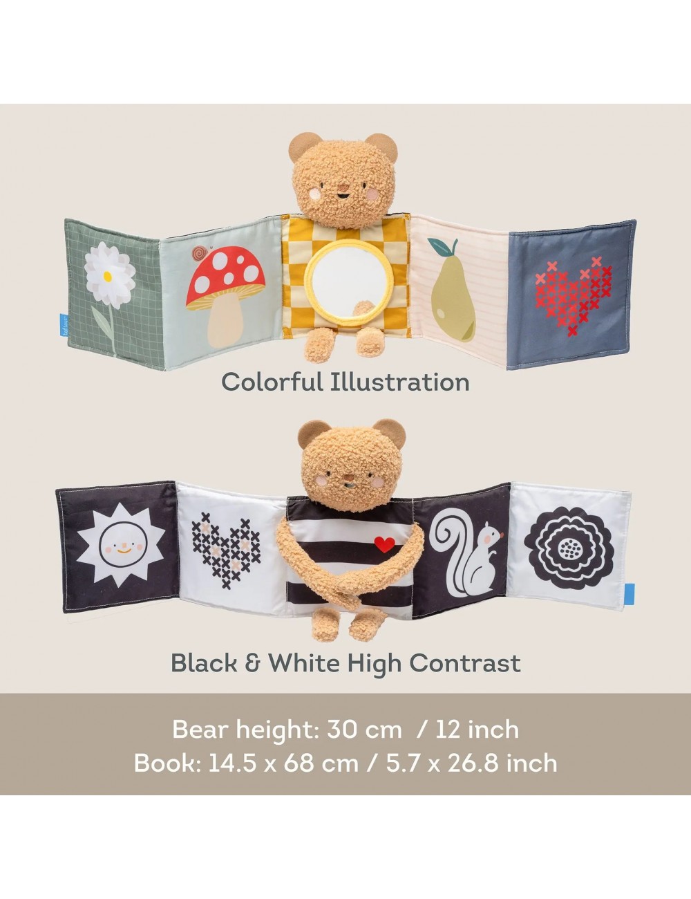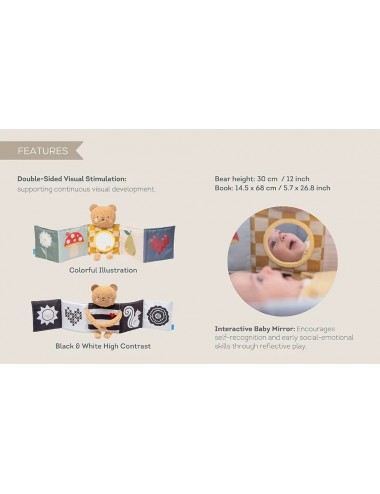 Le Snuggle Bear Book est un livre sensoriel double face destiné aux nouveau-nés. Ce livre pliable contient un ours en peluche tout doux à câliner, un côté contrasté (noir et blanc) pour les nouveau-nés et un côté aux couleurs vives pour la stimulation visuelle. Un miroir pour bébé permet de s'amuser de manière interactive, tandis que l'ourson devient un compagnon pour les moments passés sur le ventre ou les déplacements. Parfait pour câliner et jouer !