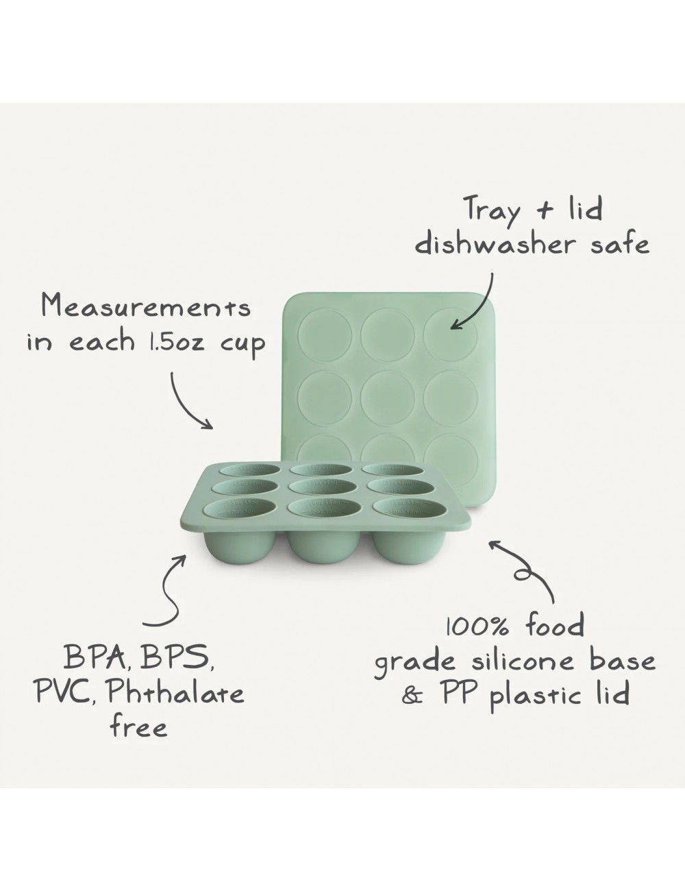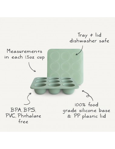 Simplifiez la préparation des repas de bébé avec notre plateau de congélation en silicone, parfait pour conserver les aliments et le lait des tout-petits. Les neuf tasses contiennent chacune 1,5 oz (4,5 ml) et comportent des marques intérieures en onces et en millilitres pour éliminer les incertitudes liées à la mesure. Les articles surgelés sortent facilement de la base en silicone et le couvercle à clipser en plastique sans BPA maintient vos aliments en sécurité et votre congélateur sans dégâts.