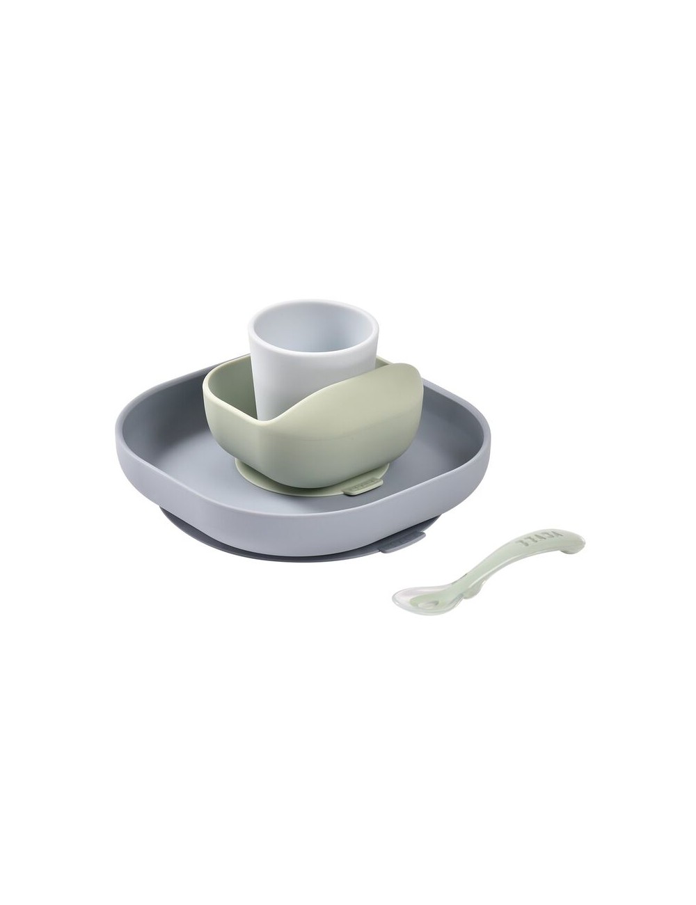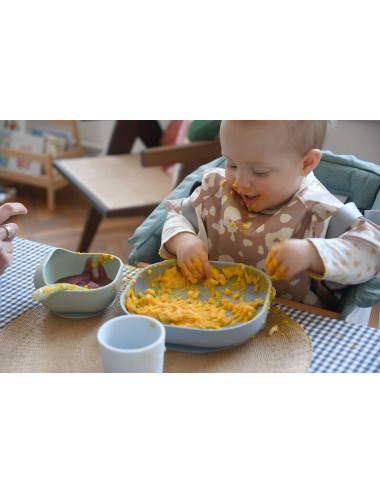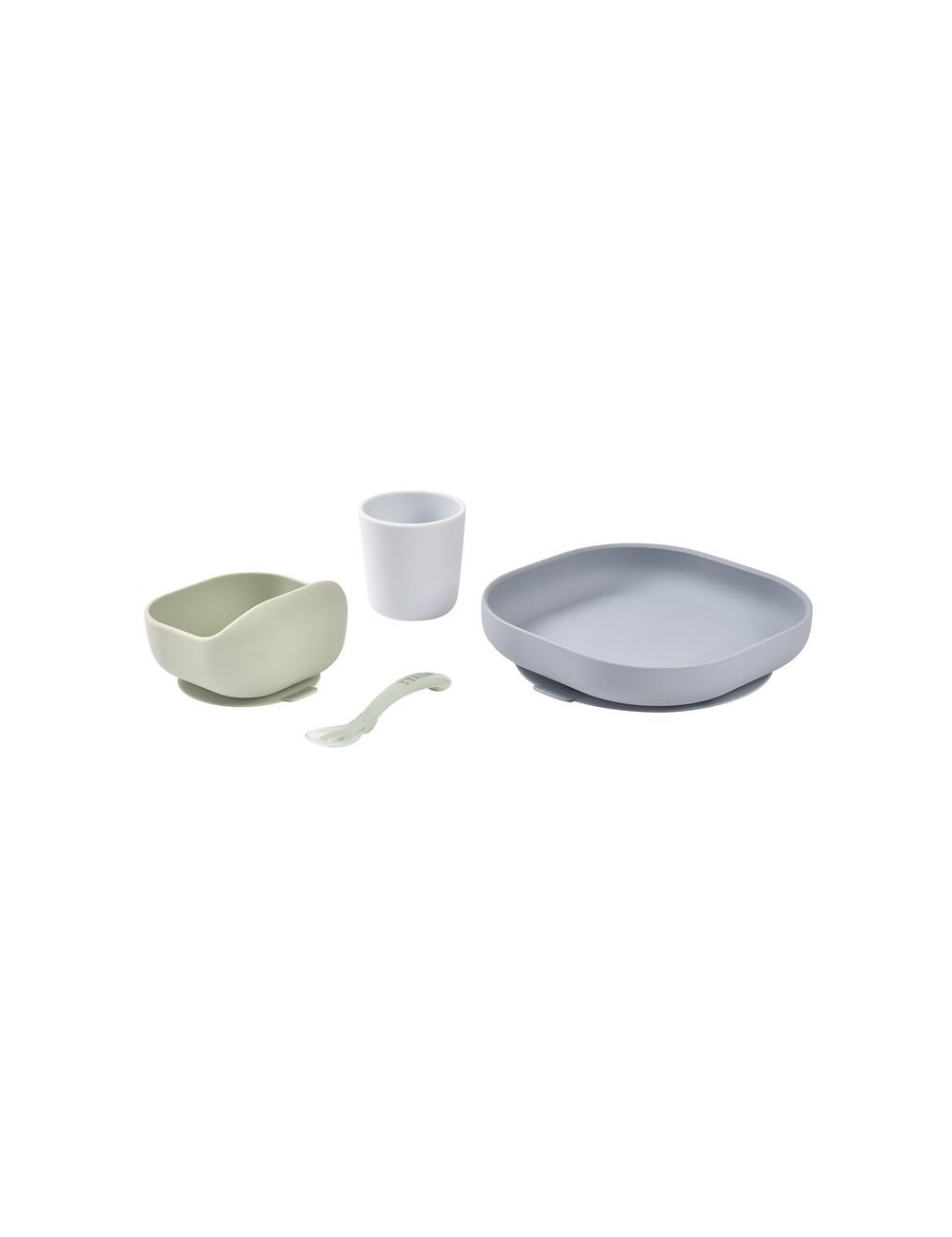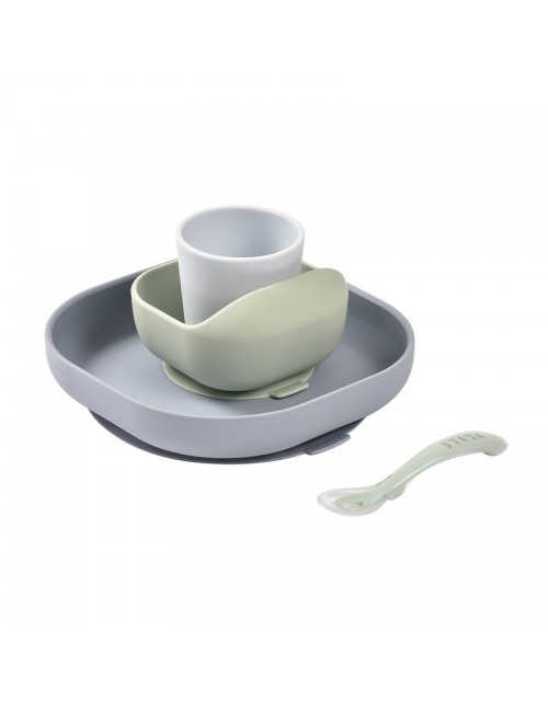 Coffret repas silicone composé d’une assiette et d’un bol avec ventouse, d’un verre et d’une cuillère 2ème âge silicone