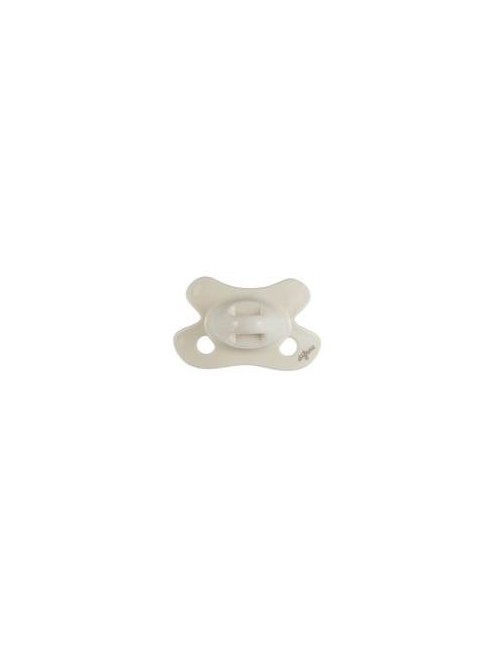 La Sucette Natural 0-6 Mois de Difrax dispose d'une téterelle symérique en silicone doux qui correspond au besoin de succion des bébés de 0 à environ 6 mois.